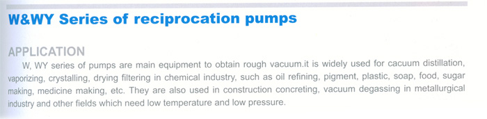| W、WY系列往复式真空泵 用途及特点: W、WY系列往复式真空泵是获得粗真空的主要设备。广泛用于炼油、颜料、塑料、肥皂、食品、制糖、制药等方面的真空蒸馏、蒸发结晶、干燥过滤;建筑方面的混凝土作业;冶金工业中的真空除气以及其他部门需要的低压、低温作业。